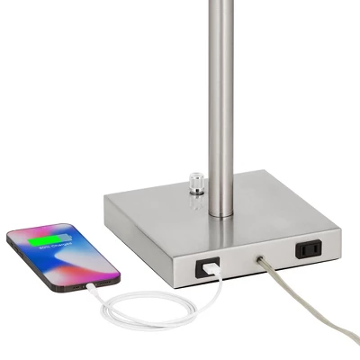 - Metal construction. White drum lamp shades. Built-in 2A USB port and outlet utility plug.