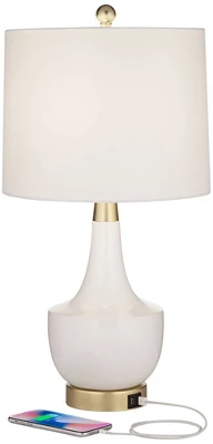 From the 360 Lighting brand, these sleek table lamps combine Mid-Century modern style with modern-day convenience. Each has a decanter-shaped profile ceramic lamp base in white. Gold finish metal accents at the neck and base provide a touch of glamour. The lamps have twin built-in USB ports in their bases, giving you an easy way to keep your phones and other electronic devices charged up and close at hand.