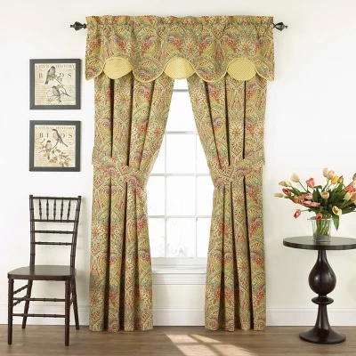 Refresh any room in your home with classically elegant window treatments by Waverly®. This timeless valance features an ornate paisley design layered over an elaborate crosshatch pattern in a golden neutral . Valance measures 60″ wide x 18″ long. Hang coordinating panels and valance on standard or decorative curtain rod. 2 inch header adds decorative flair. 3 inch rod pocket is recommended with up to a 1.5 inch rod. Curtain rod sold separately. Coordinating Waverly Swept Away bedding, accent pillows, and drapery pair sold separately. 100% cotton with cotton lining. Machine wash cold, gentle cycle. Tumble dry low. Cool iron of needed.