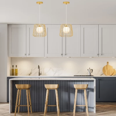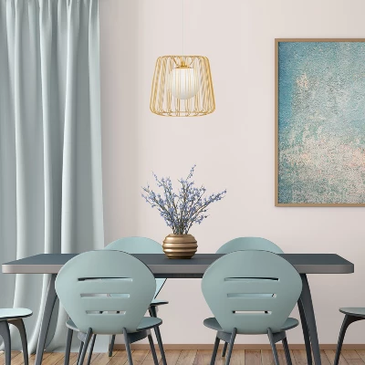 If your home features industrial-style decor, you’ll love the addition of the 9.875″ W Lucas Caged Globe Shade Pendant Light from River of Goods. This unique pendant light showcases a gold-finish canopy and a frosted white glass globe shade encased in a gold metal cage. It requires one 7-watt E12 bulb (not included) to cast a soft, warm glow. Plus, the adjustable hanging wire lets you easily alter the drop height from 10 to 58 inches to best suit your space.