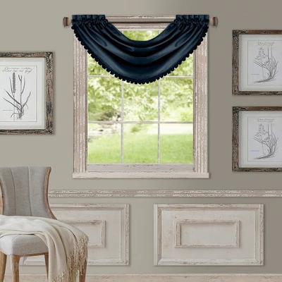 - Provides elegant silk look and room darkening benefits. Waterfall valance features scalloped decorative trim and a beautiful drape.