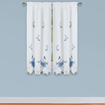 These charming, embroidered curtains feature a lovely blue and yellow floral border with beautiful butterflies flying above. The white curtains have a pretty cutout border with intricate details, and rod pocket tops make hanging easy. Panel pairs include tie backs and are available in 2 lengths. Valance, swag set and panel set sold separately. Machine wash. Polyester; imported. Choose: Valance (14″L x 58″W), Swag Set of 2 (36″L x 29″W each), 63″ Panel Pair (42″W x 63″L each) or 84″ Panel Pair (42″W x 84″L each).