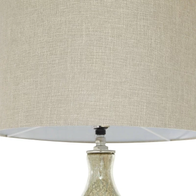 Neutral yet rich in texture, this beige glass table lamp features glossy and reflective mercury glass with beige hues throughout the transparent, vase shaped base with a marbled effect. The modern and glam inspired drum lamp shade is a soft wheat beige linen that softly diffuses light. The stem and bottom rim are a reflective polished silver, adding some extra shine. This glass lampshade is designed with a black rubber stopper at the base that prevents scratching furniture and table tops, as well as sliding around. Uses one standard E26 bulb (not included). This item has a 64″ cord. Suitable for indoor use only. This item carries a drum shape shade. This item conveniently turns on and off via a switch. This item comes shipped in one carton. Due to the nature of this item, no two will be alike, there will be slight differences in shape, size, and color.