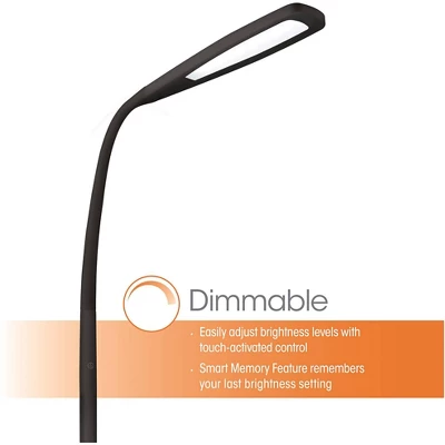 This hardworking LED floor lamp from OttLite seemingly does it all. Super bright LEDs produce a natural day quality light up to 700 lumens. The 12 1/2 inch LED array tops an adjustable column and rubberized gooseneck for a versatile light capable of providing a wide area of illumination. Touch-dimmer allows for simple operation, while a smart memory features automatically remembers your most recent brightness setting. In a matte black finish.