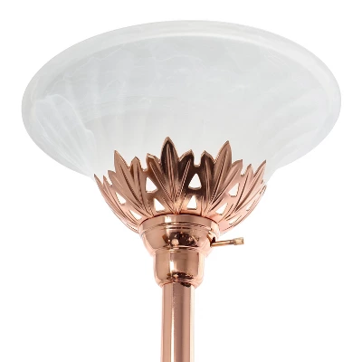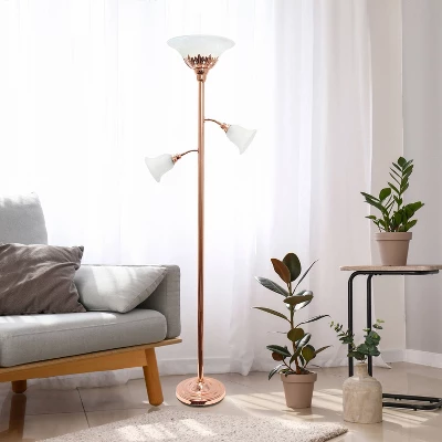 Brighten up your living space with this elegant 3 light floor lamp. It features 2 adjustable reading lights with a main torchiere light so that you can manipulate the light to focus on the area of your choice. The beautiful gold metal base is accented by scalloped white glass shades to complete the timeless look. Perfect for your bedroom, office, foyer or living room!