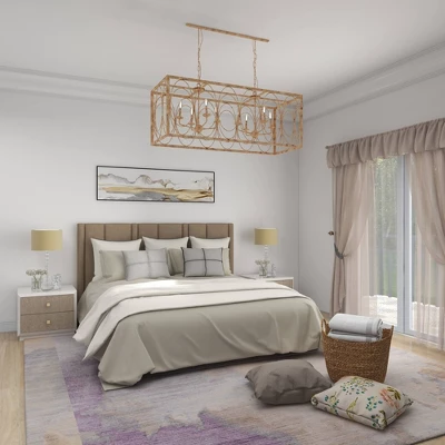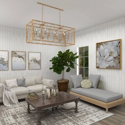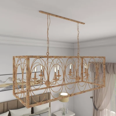 Maximize your ceiling space to add depth and dimensions in your home with this gorgeous chandelier. Beautifully designed and well crafted chandelier features eye catching structure for a mesmerizing focal point any where in your home. Hang this vintage gold rectangular chandelier in your lobby or living room for an elegant illumination. Requires 8 40W Type A E12/Candelabra bulbs. This item ships in 1 carton. Hang decorative light with hardwired canopy and chain; nails and screws are not included. Suitable for indoor use only. This item ships fully assembled in one piece. Includes a hardwire switch. This is a single gold colored ceiling light. Vintage style.